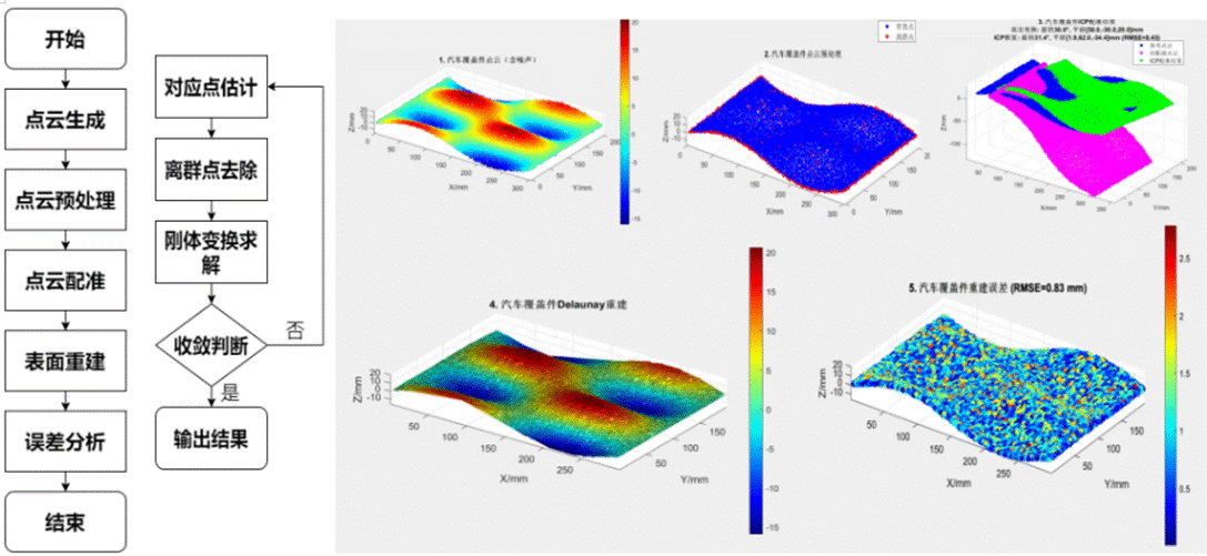 3. 算法研究学习:点云数据的生成、点云数据预处理、点云滤波、点云配准、表面重建,最后分析误差来源,完成误差分析。