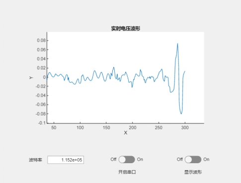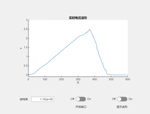 其中,XGZP6847A传感器作为本设计中的核心器件之一,它直接影响了血压脉搏计的测量精度,我使用硅胶软管以及一些软管接头将该传感器与微型气泵、泄压阀和血压计袖套密封连接了起来。同时,为了能更直观地观察到该气压传感器的测得值以便后续的代码调试,我利用matlab的app designer设计了一个简易的数字示波器,并在keil5中编写相应的代码使单片机能通过串口将气压测得值(电压值)传送到电脑中,这样就能把气压值波形画出以便后续对这些气压值进行相应的处理,下图中展示的是我编写的简易数字示波器界面: