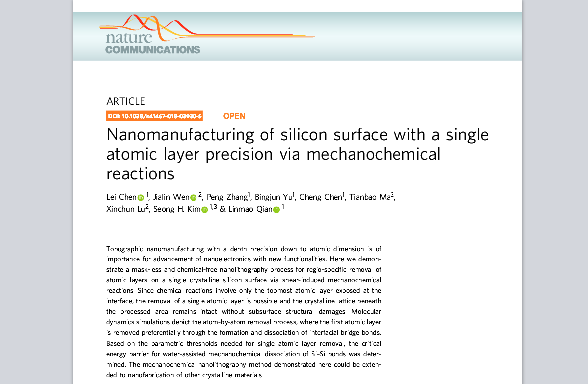 Recently, the ultra-precision surface manufacturing team of the Institute of Tribology of the School of Mechanical Engineering, with Southwest Jiaotong University as the first corresponding affiliation, cooperated with the State Key Laboratory of Tribology of Tsinghua University and wrote a report on the semiconductor in Nature Communications. Research progress in the ultimate processing of wafer materials has enabled the controlled removal of single-layer silicon atoms. This is the first paper published in this Journal led by Southwest Jiaotong University. The first author of the paper is Lei Chen, associate researcher of the School of Mechanical Engineering. The co-corresponding author is Professor Linmao Qian of the School of Mechanical Engineering and Professor Xinchun Lu of the State Key Laboratory of Tribology of Tsinghua University.