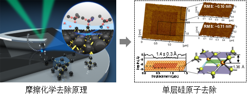 Unlike the wear, fracture and plastic deformation of materials in traditional machining, the tribochemical removal of monocrystalline silicon atomic materials is mainly attributed to the stripping of the silicon atoms in the matrix under the atomic bonding between the sliding interfaces. Therefore, the subsurface crystal structure after the removal of the atomic layered material remains intact and no defects such as slip or lattice distortion are generated. This study gives direct evidence for the atomic layer removal of single crystal silicon materials by high-resolution transmission electron microscopy. Combined with molecular dynamics simulation, it reveals the tribochemical peeling mechanism of silicon atoms and the ultimate precision processing of semiconductor wafer materials. It has also made greatly progress in the study of limiting precision fabrication of semiconductor wafer materials..